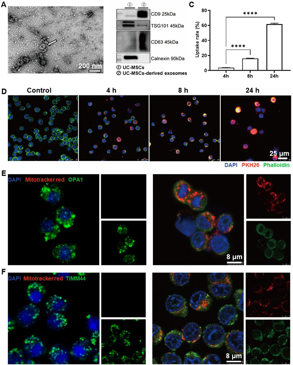 图1. 人脐带间充质干细胞来源外泌体的表征、细胞摄取及线粒体转运