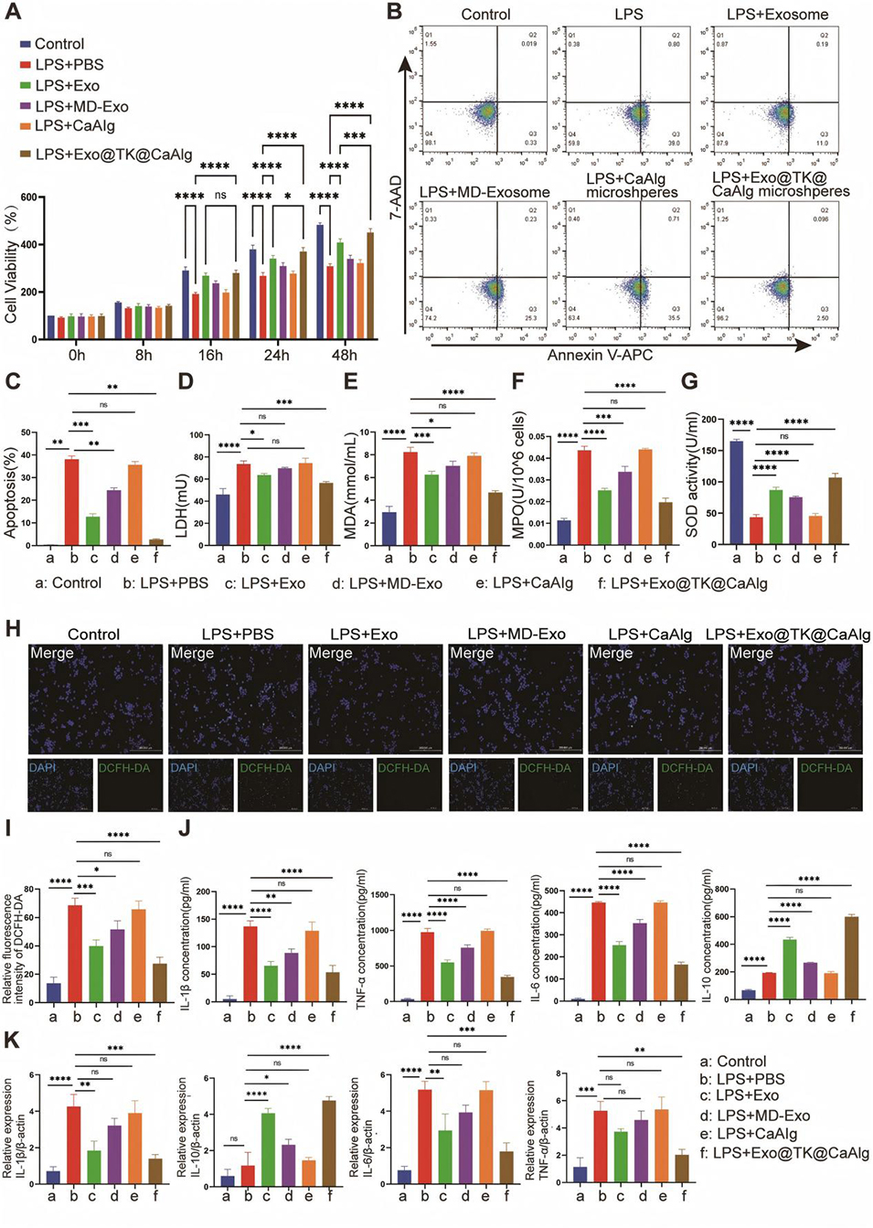 图3. Exo@TK@CaAlg水凝胶微球的体外抗凋亡、抗氧化、抗炎及活性氧清除能力
