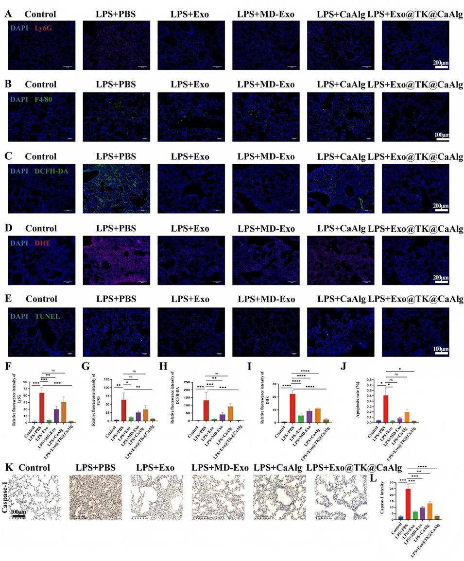 图6. Exo@TK@CaAlg水凝胶微球对脂多糖诱导的急性肺损伤小鼠肺部炎症、氧化应激、蛋白通透性及组织学损伤程度的治疗作用