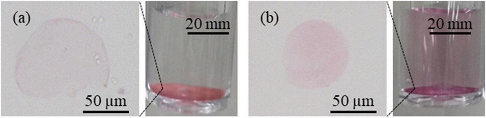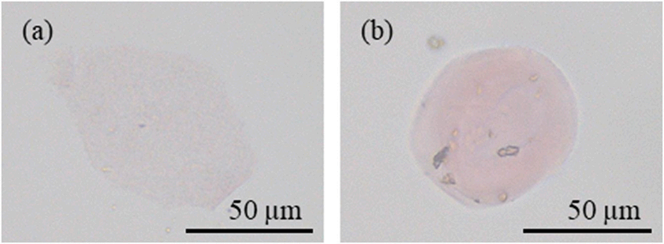 图4. 含金纳米颗粒的壳聚糖凝胶微胶囊在模拟胃液中浸泡24小时后的数码显微镜图像:(a)离子交联法,(b)反溶剂沉淀法 + 磷钨酸增强处理