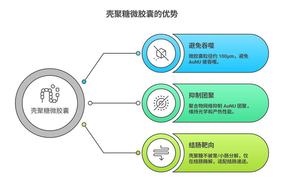 3、该微胶囊解决了AuNU在药物递送中易被吞噬、易团聚的核心问题,且酸稳定性适配结肠递送需求,虽IMS存在产率低的问题,但其高重现性使其适合高价值的药物递送领域,为AuNU在活体筛查、光热治疗等医疗领域的应用奠定了坚实基础。