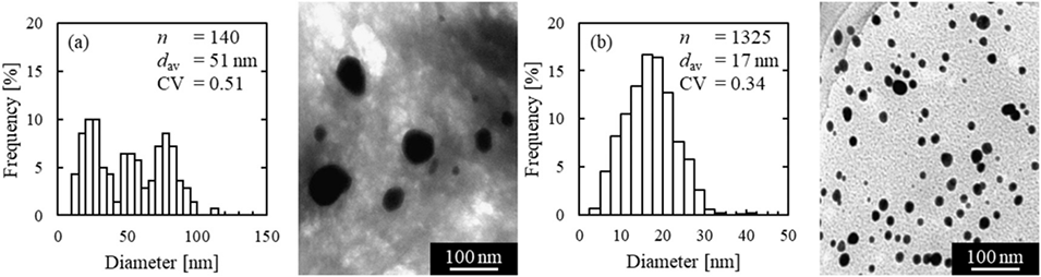 图3. 微胶囊内金纳米颗粒的粒径分布及透射电镜图像:(a)离子交联法,(b)反溶剂沉淀法。图中CV为变异系数