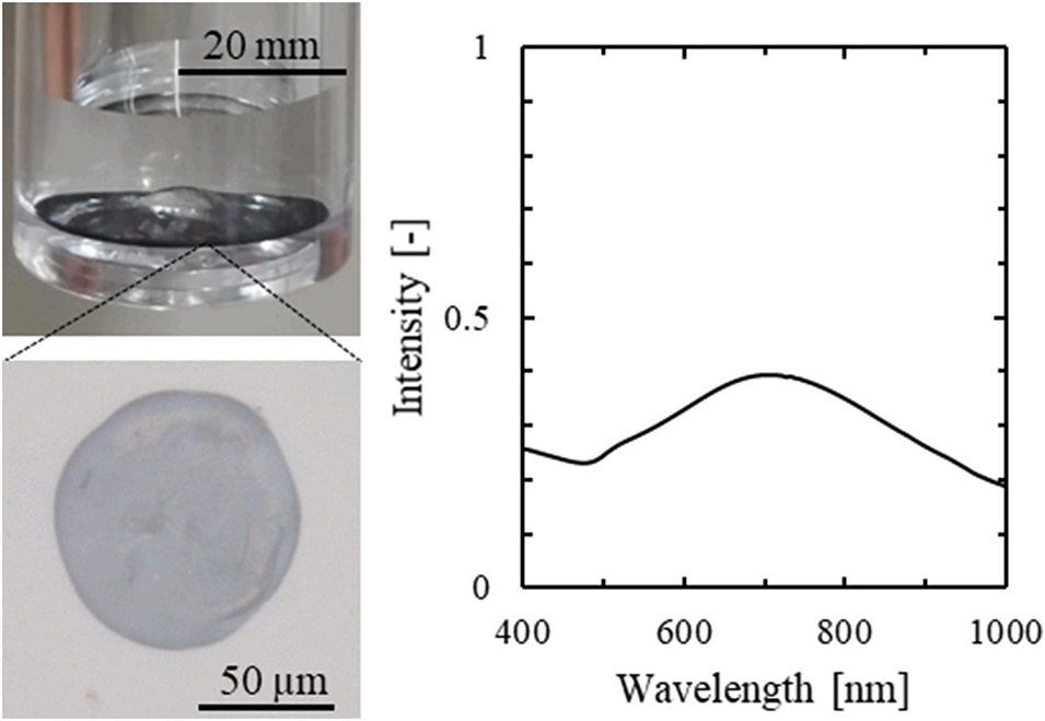 图6. 产物悬浮液外观、吸收光谱及微胶囊的数码显微镜图像。实验条件:喷射液滴为表1中的A3和B3溶液,收集液为含30 mM抗坏血酸与30 g/L磷钨酸的去离子水溶液,刺生长用氯金酸浓度为3 mM