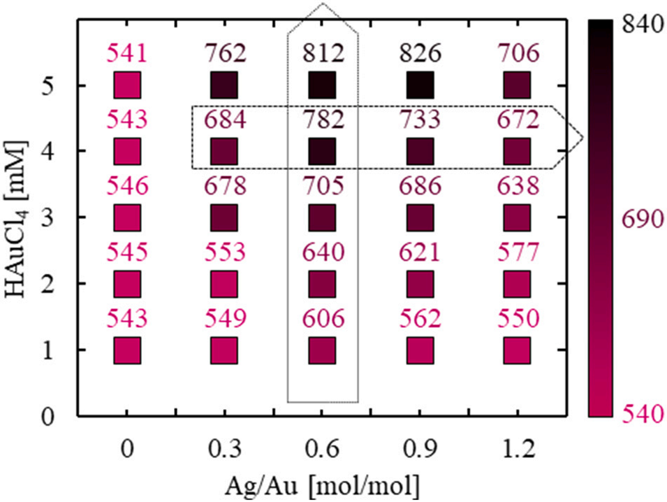 2、同时通过银离子介导,利用IMS成功合成了含海胆状金纳米颗粒(AuNU)的壳聚糖微胶囊,证实该微胶囊的吸收波长可通过调控种子颗粒表面银量(Ag/Au比)和刺生长阶段的金离子(HAuCl₄)浓度实现精准控制,其中金离子浓度升高使吸收峰波长单调增加,银量增加则让吸收峰波长先升后降(最佳Ag/Au比约0.6mol/mol)。