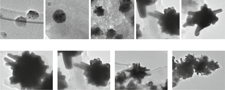图8. 合成颗粒的透射电镜图像。(a)氯金酸浓度对刺生长的影响,银金摩尔比= 0.6 mol/mol(b)液滴碰撞时银金摩尔比对颗粒的影响,氯金酸浓度= 4 mM