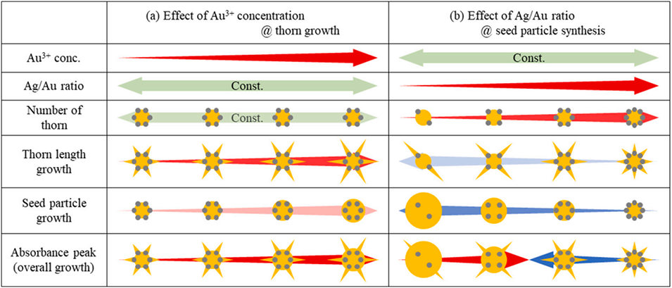 图9. 海胆状金纳米颗粒生长行为及吸收峰变化的概念图。(a)刺生长阶段金离子浓度的影响,(b)种子颗粒合成时银金摩尔比的影响
