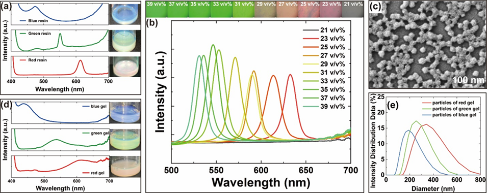 图3. (a) 25 vol%下,由不同粒径二氧化硅颗粒制备的蓝、绿、红三色光子型PEGPEA树脂的反射光谱与实物照片;(b) 相同平均粒径的二氧化硅在不同体积分数下分散于PEGPEA树脂中制得的树脂悬浮液实物照片及对应反射光谱;(c) 冷冻干燥后PNIPAM-co-AAC凝胶颗粒的扫描电镜图像;(d) 由不同粒径凝胶颗粒制备的蓝、绿、红三色光子型PNIPAM-co-AAC凝胶分散液的反射光谱与实物照片;(e) 动态光散射法测得的三种颜色凝胶悬浮液对应凝胶颗粒的粒径分布曲线