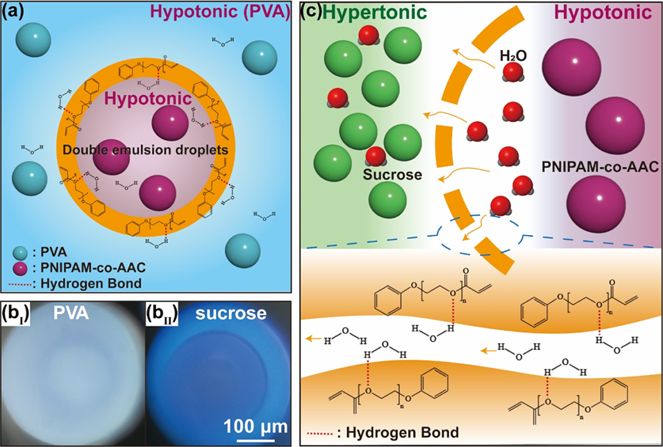 图5. (a) 低渗PVA外相中氢键形成的示意图;(bⅠ) 以10 wt% PVA水溶液为外相的微球显微图像;(bⅡ) 以含16 wt%蔗糖和1.8 wt% PVA的水溶液为外相的微球显微图像;(c) 高渗蔗糖外相改善双乳液光学质量的原理示意图
