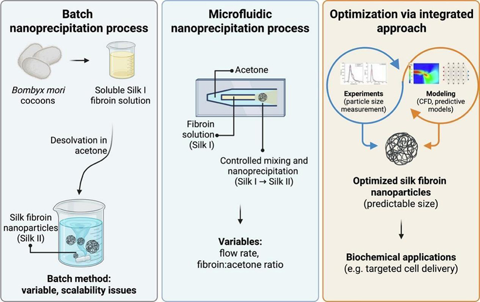 近期,有研究人员构建了融合实验设计、数据驱动建模与计算流体动力学模拟的实验-计算一体化框架,系统优化微流控法制备丝素蛋白纳米颗粒的工艺并解析其形成机理。该研究通过调控丝素蛋白与丙酮的体积比、总流速两大关键参数,结合多种模型与模拟技术,筛选出制备小尺寸、高均一性纳米颗粒的最优操作条件,还建立了可机理解析、具备迁移性的研究流程,为相关聚合物的微流控纳米沉淀工艺优化提供了重要参考。相关研究以“Microfluidic production of silk fibroin nanoparticles: Process optimization and modeling”为题目,发表在期刊《International Journal of Pharmaceutics》上。