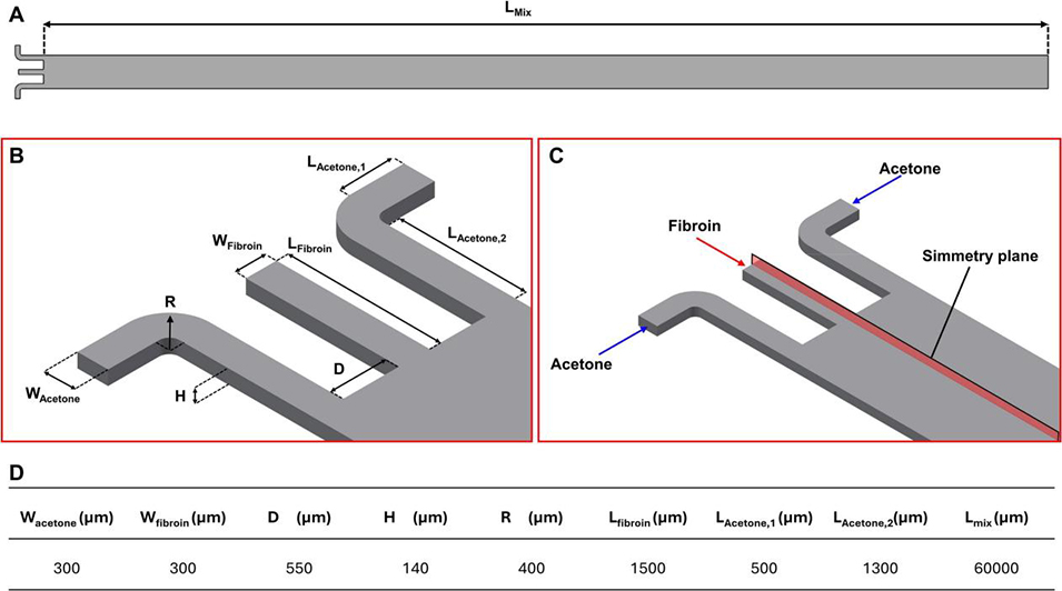 图2.(A)Fluidic 640型微流控芯片的流体域;(B)进样口的放大图及其尺寸参数(微米级数值见D部分);(C)丝素蛋白水溶液由中间通道注入(红色箭头),用于脱溶的丙酮由两侧通道注入(蓝色箭头),红色高亮区域为用于简化并缩小计算域的对称面;(D)用于重构数值计算域的微流控芯片各项尺寸参数。