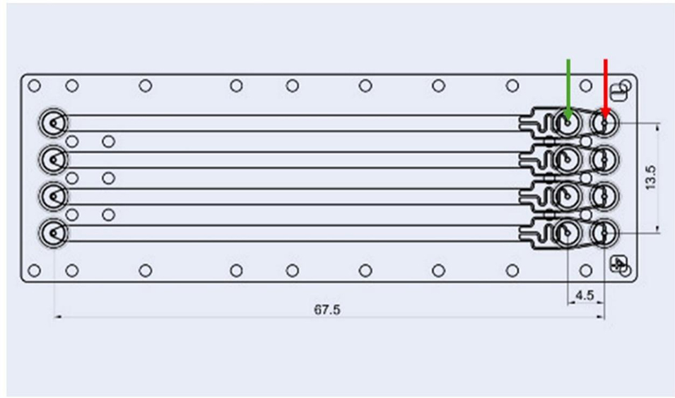 图1. Fluidic 640型微流控芯片的几何结构。每块微流控芯片均包含四条通道,所有通道的几何布局一致。红色箭头指示丙酮的进样位置,绿色箭头指示丝素蛋白的进样位置。