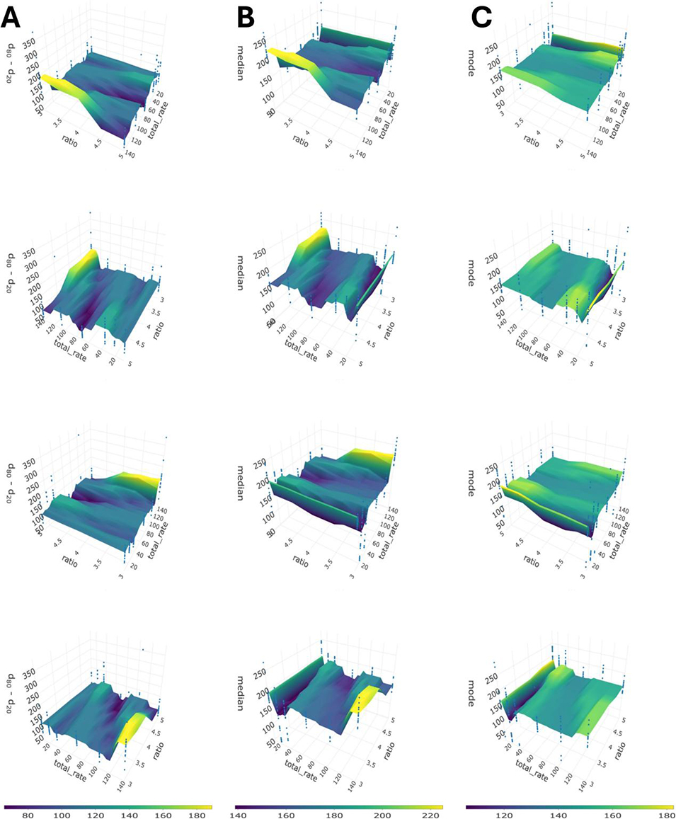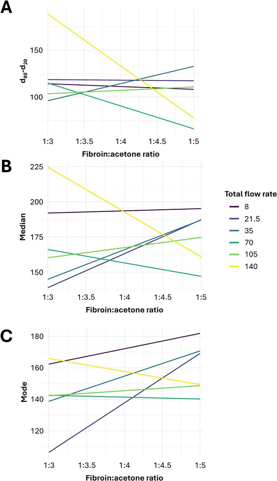 图3. 交互作用图,展示丝素蛋白:丙酮体积比与总流速对(A)粒径分布均一性(d₈₀-d₂₀)、(B)中位粒径、(C)众数粒径的影响。图中中位粒径、众数粒径及 d₈₀-d₂₀的单位均为纳米,总流速的单位为毫升/分钟。