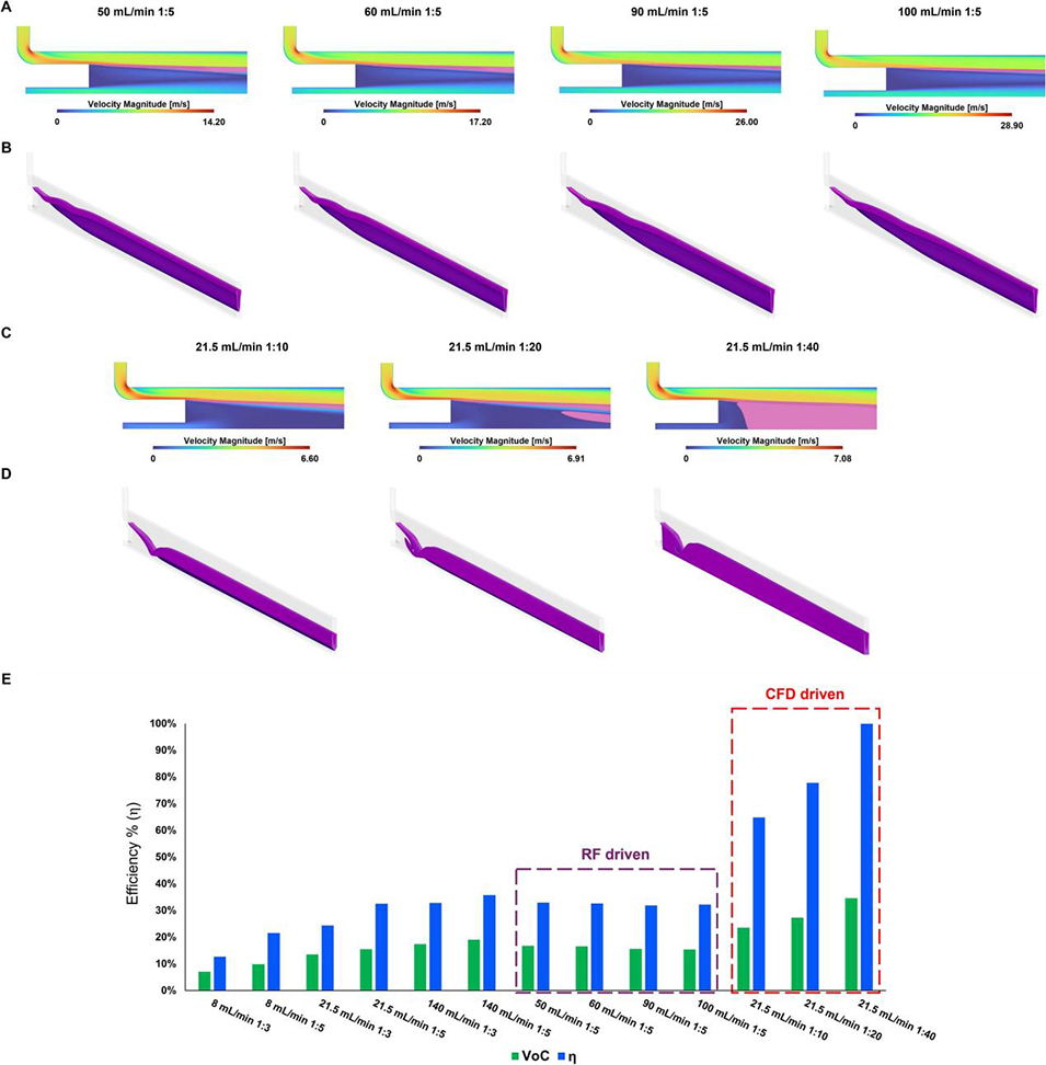 图6.(A)丝素蛋白:丙酮体积比为 1:3、总流速逐步增大时,微流控芯片进样口区域的速度云图(叠加紫色体积变化值 VoC 区域);(B)上述相同条件下,体积变化值 VoC 沿芯片通道的分布形态;(C)丝素蛋白:丙酮体积比为 1:5、总流速逐步增大时,微流控芯片进样口区域的速度云图(叠加体积变化值 VoC 区域);(D)上述相同条件下,体积变化值 VoC 沿芯片通道的分布形态;(E)柱状图,展示各研究边界条件下的体积变化值 VoC 与工艺效率 η(%)。