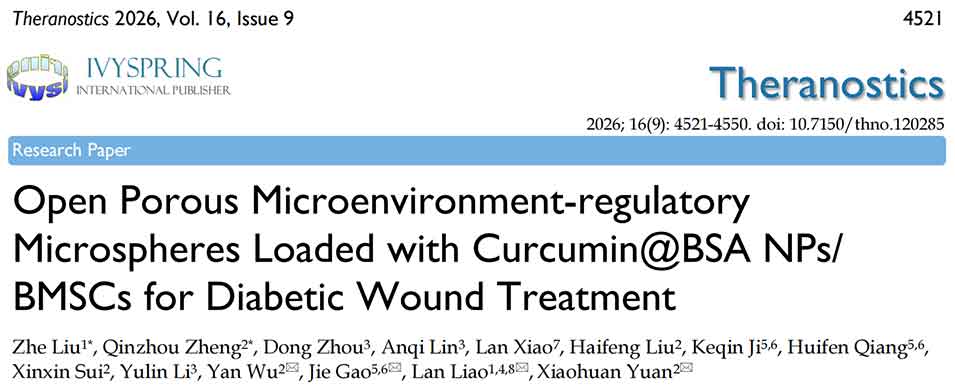 针对这一难题,南昌大学附属口腔医院廖岚教授联合牡丹江医科大学袁晓环教授、武艳副教授等人设计并研发了负载姜黄素@牛血清白蛋白纳米粒(Curcumin@BSA NPs)和骨髓间充质干细胞(BMSCs)的开放多孔微环境调控PLGA微球(BMSC@COPM),通过材料设计、体外实验和动物模型验证了其优异的糖尿病创面修复效果,并揭示了相关作用机制。该研究以“Open Porous Microenvironment-regulatory Microspheres Loaded with Curcumin@BSA NPs/BMSCs for Diabetic Wound Treatment”为题目,发表于期刊《Theranostics》。