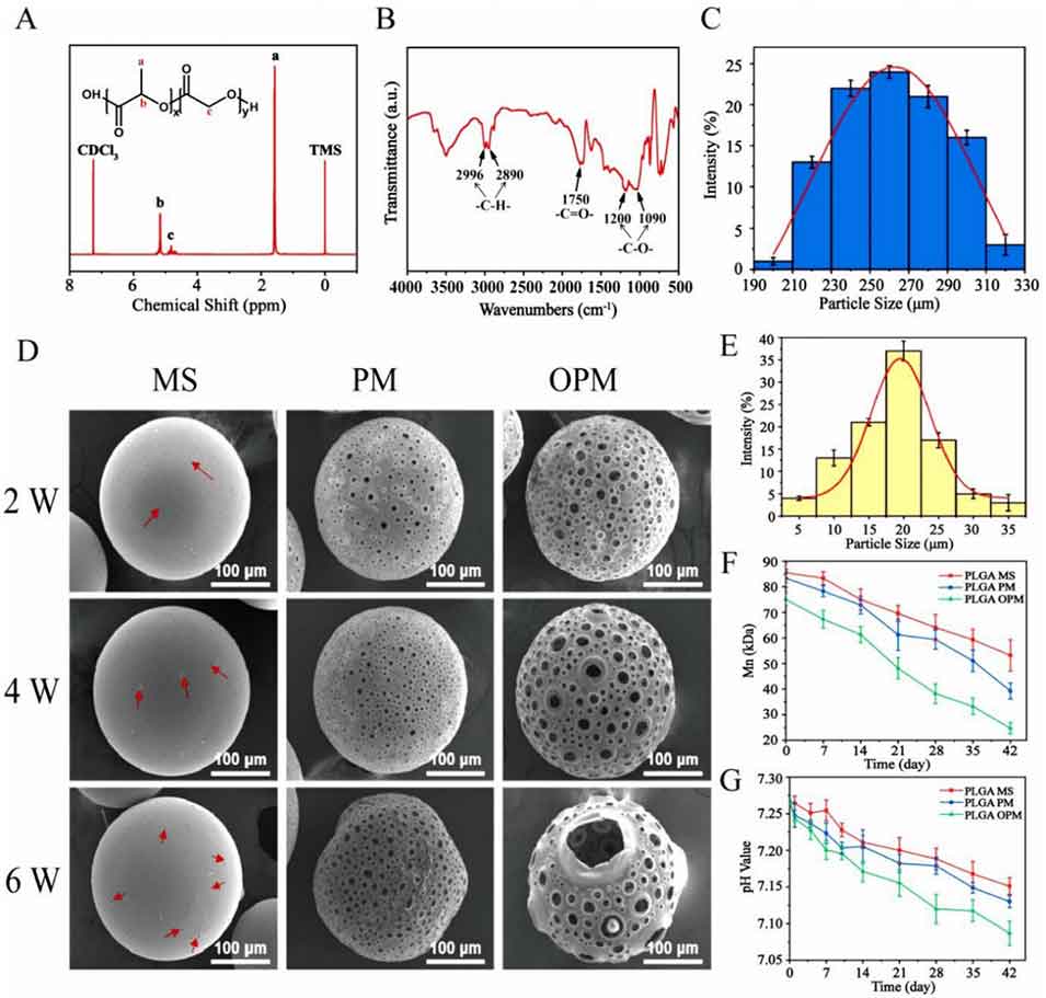 1、PLGA微球制备:以PLGA为基材,通过气体辅助挥发微乳液技术,利用NH₄HCO₃分解产生NH₃和CO₂造孔,结合0.25M NaOH醇溶液碱处理,依次制备实心微球(MS)、多孔微球(PM)、开孔微球(OPM),优化搅拌速度为800rpm,获得尺寸均一的微球;
