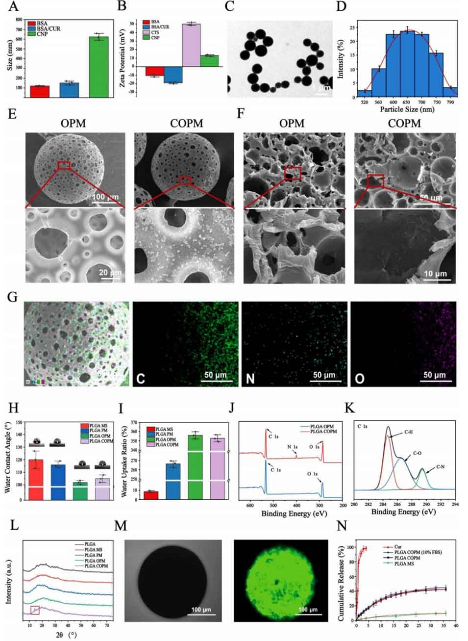 1、本研究通过气体辅助挥发微乳液技术结合表面碱处理,设计合成了开放多孔聚乳酸-羟基乙酸共聚物(PLGA)微球,将姜黄素与牛血清白蛋白(BSA)制备为纳米颗粒并接枝于微球,同时负载骨髓间充质干细胞(BMSCs)构建出BMSC@COPM复合体系。