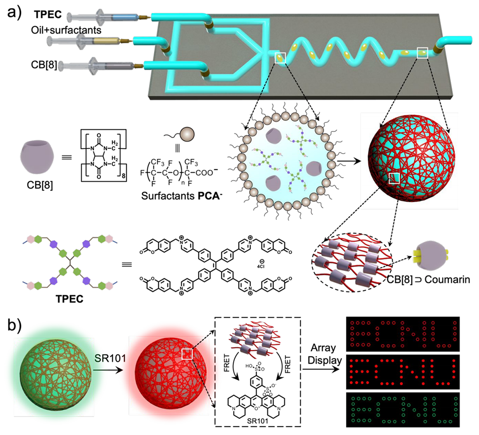 图1. (a) 微流控液滴介导的超分子有机框架界面组装示意图,其中引入带负电的表面活性剂(PCA⁻)调控四香豆素功能化聚集诱导发光配体(TPEC)与葫芦[8]脲(CB[8])的界面组装过程;(b) 包封磺基罗丹明101(SR101)后,微胶囊内TPEC⊂CB[8]复合物与SR101间发生荧光共振能量转移,实现多通道液滴阵列显示“ECNU”图案。