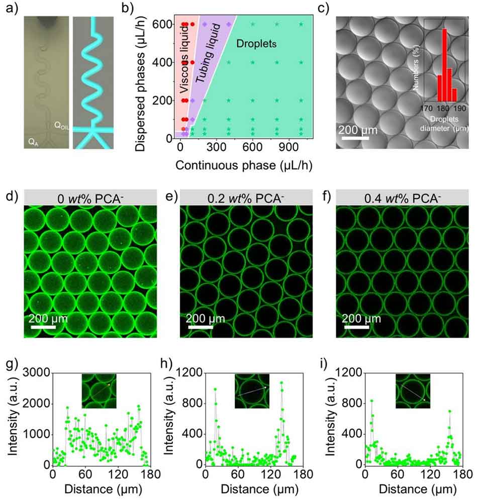 图2. (a) 三入口流动聚焦微流控液滴芯片的结构示意图;(b) 微流控芯片中连续相和分散相在不同流速下的液滴流型统计图谱;(c) 代表性微液滴的激光扫描共聚焦显微镜明场图像,插图为微液滴的粒径分布直方图;(d-f) 不同连续相配方制备的液滴激光扫描共聚焦显微镜荧光图像:(d) 含1 wt%中性表面活性剂(PPP)的氟油(FC-40)、(e) 含1 wt% PPP和0.2 wt%带负电表面活性剂(PCA⁻)的FC-40、(f) 含1 wt% PPP和0.4 wt% PCA的FC-40;(g-i) 分别对应(d)、(e)、(f)中单液滴的荧光强度定量分布曲线。