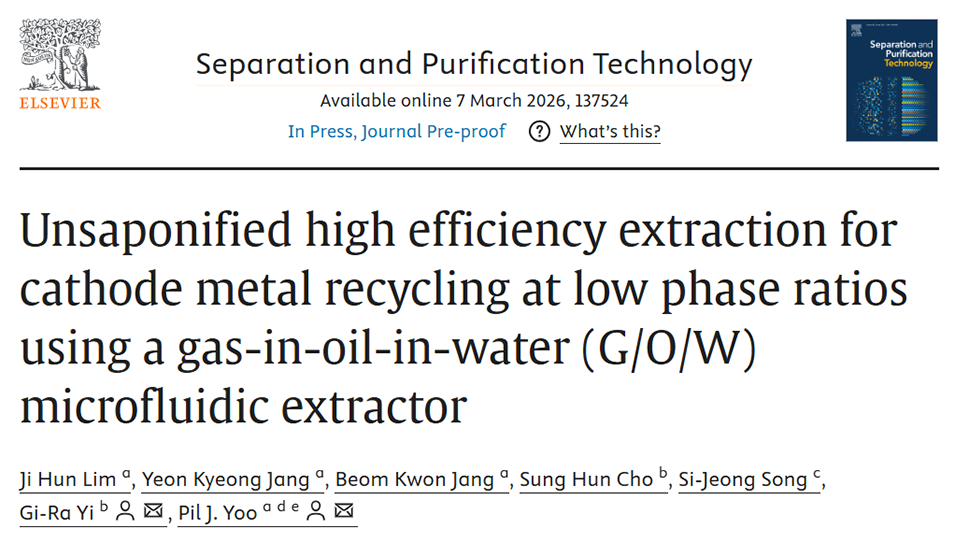 近期,成均馆大学研究团队开发出一种水包油包气(G/O/W)微流控萃取技术,用于废旧锂离子电池(LIBs)正极中Ni、Co、Mn金属的高效回收。该策略通过物理强化传质实现无皂化、低相比下的高萃取效率,解决了传统湿法冶金萃取的传质受限、溶剂消耗大、皂化带来的下游问题等痛点,为LIBs回收提供了环保且可规模化的新方案。相关研究以“Unsaponified high efficiency extraction for cathode metal recycling at low phase ratios using a gas-in-oil-in-water (G/O/W) microfluidic extractor”为题目,发表在期刊《Separation and Purification Technology》上。