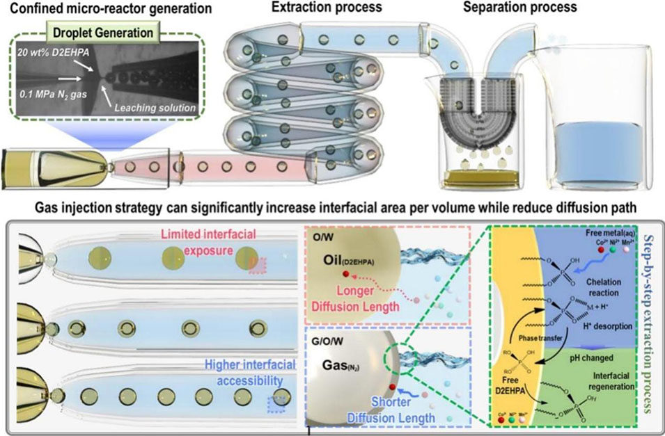 1、该研究开发了一种水包油包气(G/O/W)微流控萃取技术,用于锂离子电池(LIBs)正极金属(Ni、Co、Mn)的高效回收,其核心是通过气相诱导构建特殊界面结构,在无皂化、低相比条件下实现传质强化,解决传统液液萃取传质受限、溶剂消耗大、需化学皂化的问题。