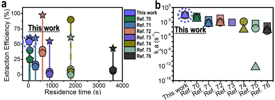 图5:文献报道的传统间歇式溶剂萃取工艺,与本研究开发的 G/O/W 微流控体系的萃取性能对比。标记形状代表金属种类(星形:Mn²⁺,圆形:Co²⁺,五边形:Ni²⁺),颜色对应色标标注的操作条件。该图展示了本体系在同等废旧锂离子电池浸出液回收条件下的相对性能。对比了本研究(蓝色虚线)与参考文献的 (a) 萃取效率、(b) 传质系数。