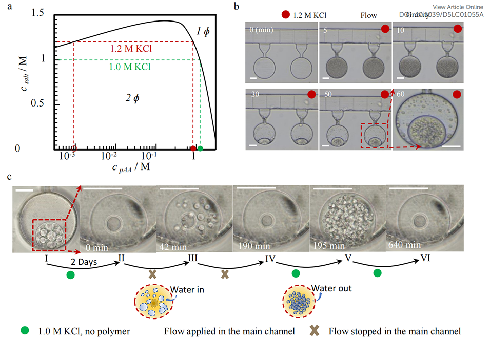 图4. 通过凝聚层相分离实现水包水(W/W)液滴的缔合型生成及可逆区室化。a 聚丙烯酸-聚甲基丙烯酸N,N-二甲基氨基乙酯体系的相图,该体系中缔合型复合凝聚层的生成条件为 pH=6.5(±0.2),此时体系正负电荷密度比为 1:1(聚丙烯酸分子量 100 kDa,聚甲基丙烯酸N,N-二甲基氨基乙酯分子量 104 kDa)。b 死端腔室中凝聚层的生成过程:步骤 1,器件内填充以 1.5 M 氯化钾稀释的 0.33 M 聚丙烯酸和 0.33 M 聚甲基丙烯酸N,N-二甲基氨基乙酯均相溶液;步骤 2,5 分钟时注入 1.2 M 氯化钾溶液以诱导相分离,并将器件竖直放置,促进分离后的凝聚层在死端腔室底部聚并。60 分钟时,单个凝聚层液滴内可观察到多个区室。c 凝聚层可逆区室化过程的时序图像:图 I,主通道通入 1.0 M 氯化钾溶液时,初始生成的含多个区室的凝聚层;图 II,经 2 天平衡后,凝聚层内除一个区室外,其余区室均消失;图 III,停止主通道 1.0 M 氯化钾溶液的通液后,区室重新形成;图 IV,经 148 分钟再次平衡,凝聚层液滴恢复至图 II 的状态;图 V,恢复主通道 1.0 M 氯化钾溶液通液后,5 分钟内凝聚层内快速重新形成多个区室;图 VI,最终凝聚层液滴达到新的准平衡状态,多个区室逐渐消失。图 II 至图 VI 左下角的时间刻度为停止 1.0 M 氯化钾溶液通液后的时长。示意图对应图 II 至图 III、图 IV 至图 V 的转变过程,分别展示了水向凝聚层内的流入和向层外的流出过程。所有图像的比例尺均为 100μm。