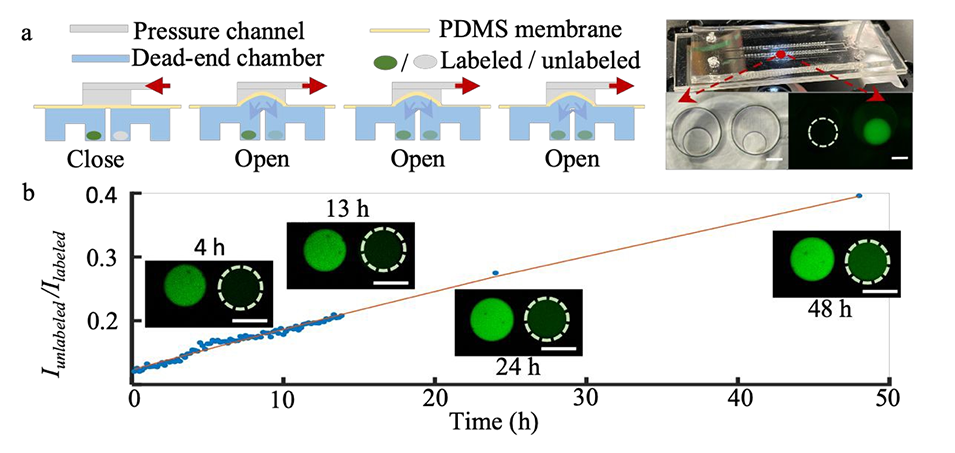 图5. 微流控芯片中的液滴间通讯。a 左侧:实现可控液滴间通讯的阀门机制原理示意图,该微流控器件包含三个核心部件:气压控制通道、聚二甲基硅氧烷膜和两个独立的死端腔室(与图 1a 所示腔室结构相似);右侧:器件实物图,以及经气动阀连通的通道中两个葡聚糖液滴的显微图像(明场 + 荧光),其中一个液滴经异硫氰酸荧光素荧光标记,另一个未标记。b 荧光强度比随时间的变化曲线及数据的线性拟合结果。比例尺:100μm。