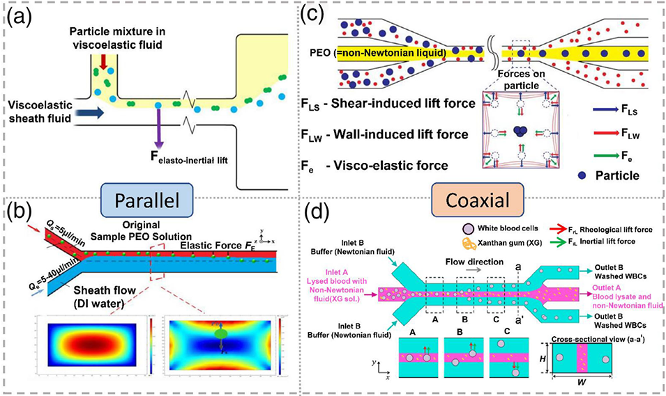 生物颗粒操控对于诊断学、治疗学及生物学研究至关重要。微流控技术具备高通量与精准调控的优势,但传统牛顿流体相关方法面临高流速导致细胞损伤、亚微米颗粒分选效率低下等挑战。为解决这些局限,粘弹性流体的引入实现了无需外场的尺寸依赖性颗粒分选。然而,单一粘弹性流动系统因存在聚焦稳定性差、复杂生物样本适配性不足、跨尺度分选效率低等问题,难以满足临床级生物颗粒操控需求。为克服上述难题,研究人员采用鞘流辅助策略,通过多流层流机制调控流体界面。在此过程中,鞘流辅助弹性惯性效应可压缩颗粒迁移路径,提升微/纳米级颗粒操控效率。