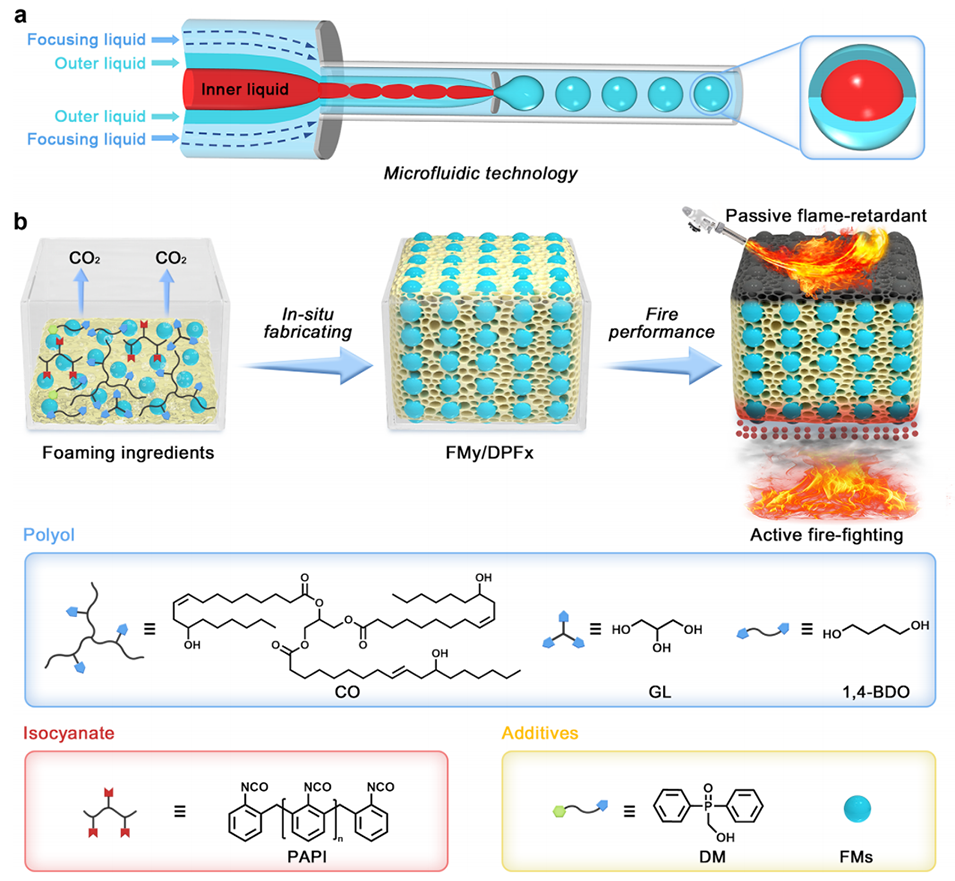 图1. (a) 微流控技术制备灭火微胶囊(FMs)的示意图;(b) 兼具被动阻燃与主动灭火性能的聚氨酯泡沫(FMy/DPFx)的制备流程