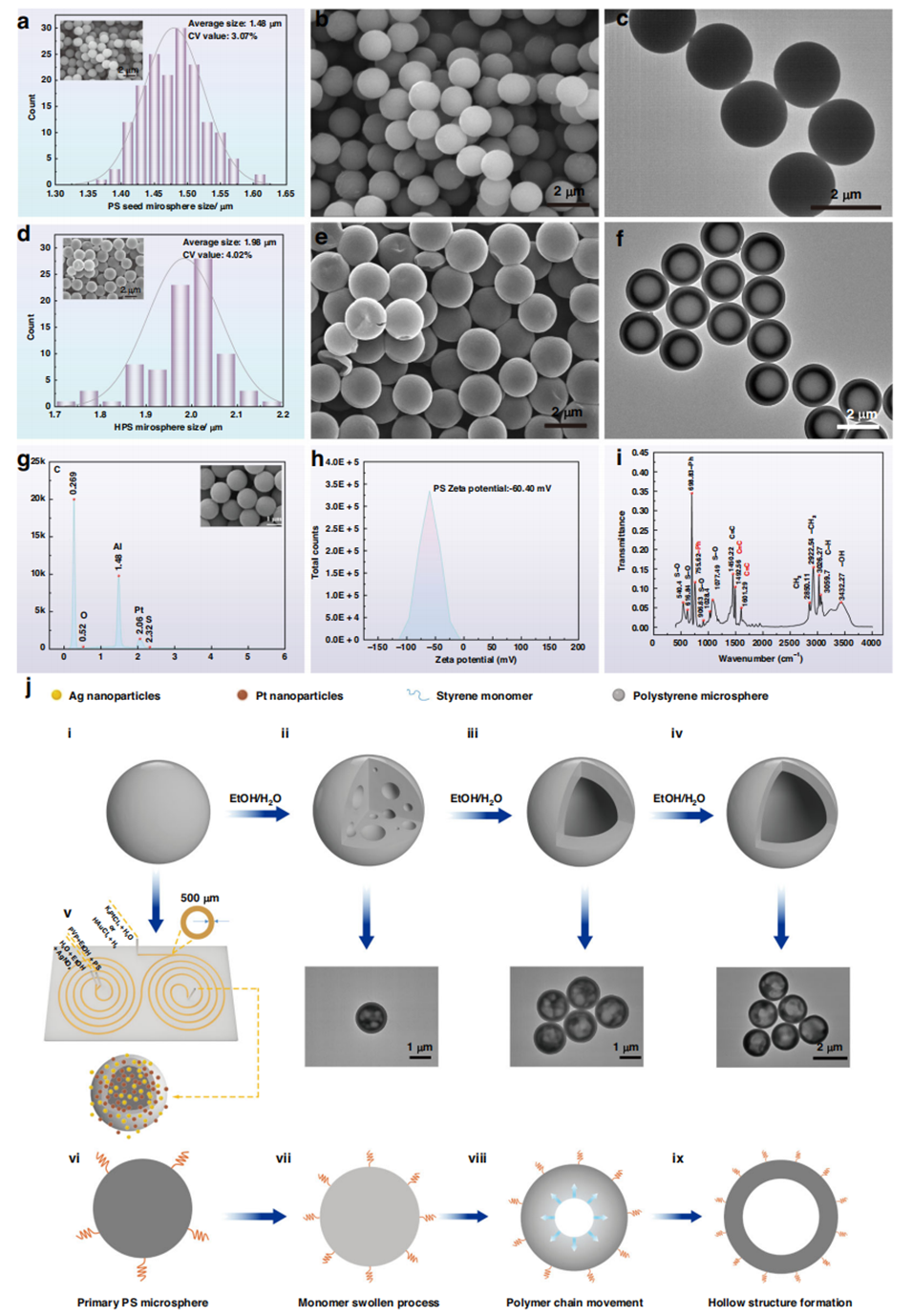 2、首先通过调控水-乙醇体积比、老化时间,在无有机溶胀剂和表面活性剂的条件下制备出空心、酒窝状、碗状 PS 微球;后续引入少量甲苯,将酒窝状微球进一步转化为开孔型微球,提出溶胀-屈曲理论解释其形貌演化机制,证明 PS 微球表面的羟基、硫酸根等基团为贵金属负载提供了位点。