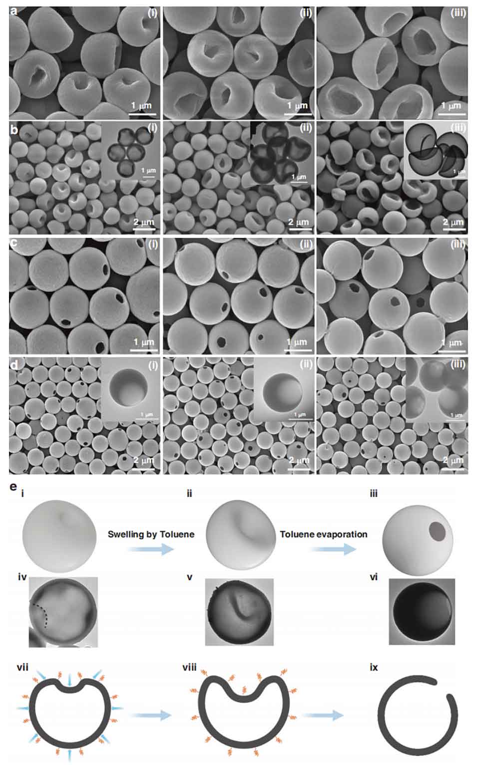 图3中空聚苯乙烯微球在水-乙醇(a~b)和水-甲苯(c~d)混合体系中的形貌演化行为(水:乙醇,体积比 = 1:7.5;水:甲苯,体积比 = 10:1)