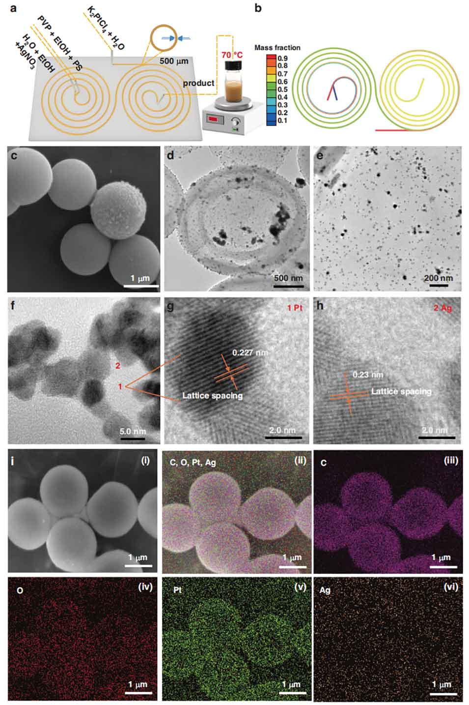 3、随后设计螺旋微通道反应器,通过一步连续流法,在数分钟内将 Ag 单金属及 Ag-Pt、Ag-Au 双金属纳米颗粒原位负载于不同形貌 PS 微球上,提出吸附-还原-渗透机制阐明负载过程;该方法解决了传统制备中步骤繁琐、耗时、纳米颗粒团聚的问题,且开孔型 PS 微球的 Ag、Pt 负载量分别达 7% 和 10%。