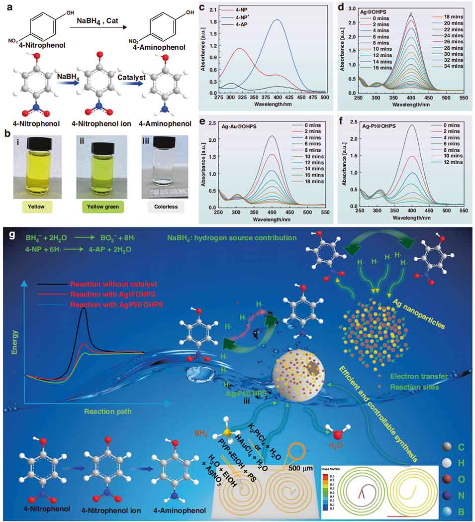4、以 NaBH₄为还原剂,将制备的复合微球用于 4-NP 还原为 4 - 氨基苯酚(4-AP)的催化反应,系统探究了载体形貌、催化剂用量、贵金属类型对催化性能的影响。结果表明,催化反应符合一级动力学,开孔型 PS 微球负载 Ag-Pt 双金属纳米颗粒(Ag-Pt@OHPS) 表现出最优催化性能,反应速率常数达 1.73×10⁻² s⁻¹,活性参数为 692 s⁻¹・g⁻¹,且经 5 次循环使用后催化活性无明显下降,稳定性优异。其高效催化源于开孔结构的大比表面积、丰富的活性位点,以及 Ag 与 Pt 的协同作用(Pt 产生活性氢并溢流,Ag 高效吸附 4-NP)。