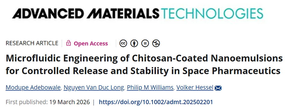 近日,发表于《Advanced Materials Technologies》的一项研究,以微流控技术为核心,开发出适用于航天领域的壳聚糖包覆褪黑素载药水包油纳米乳剂,成功解决了液态药物在太空模拟环境中的稳定性难题,同时实现了药物的可控缓释,为航天制药的研发提供了全新的微流控解决方案,也为极端地面环境的药物制备拓宽了思路。