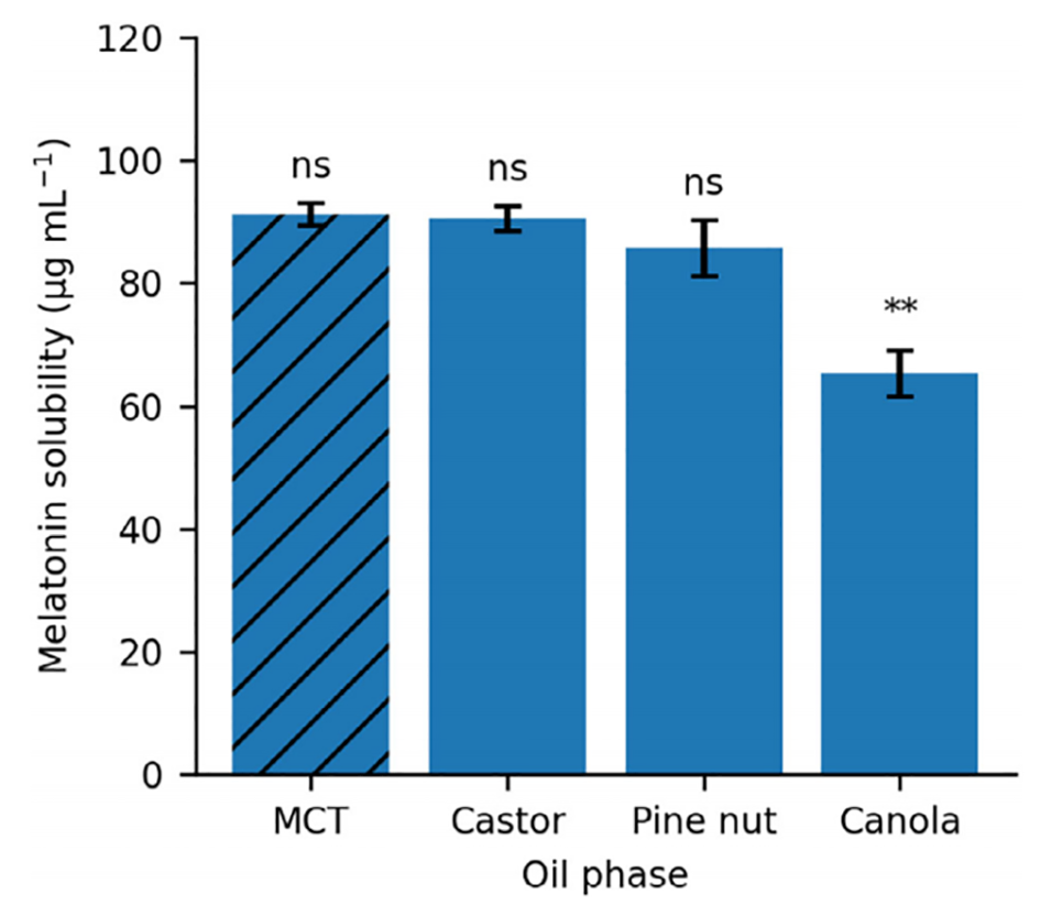 图2. 褪黑素在药用级油相中的溶解度(平均值±标准差,n=5)。中链甘油三酯油、蓖麻油和松子油对褪黑素的溶解度相近且均处于较高水平,而菜籽油的溶出能力显著更低(p<0.01,中链甘油三酯油与蓖麻油对比;单因素方差分析结合杜凯事后检验;无显著性差异标注为ns)。误差棒代表标准差。