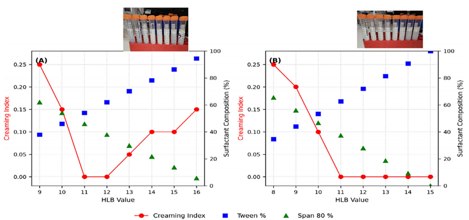 图3. 利用两种表面活性剂复配体系筛选亲水亲油平衡值以优化乳剂稳定性:(A)吐温20/司班80;(B)吐温80/司班80。以乳析指数(左轴)作为物理稳定性评价指标,吐温与司班的配比信息标注于次坐标轴。两种体系均在亲水亲油平衡值≈11的中间区间制得稳定乳剂。