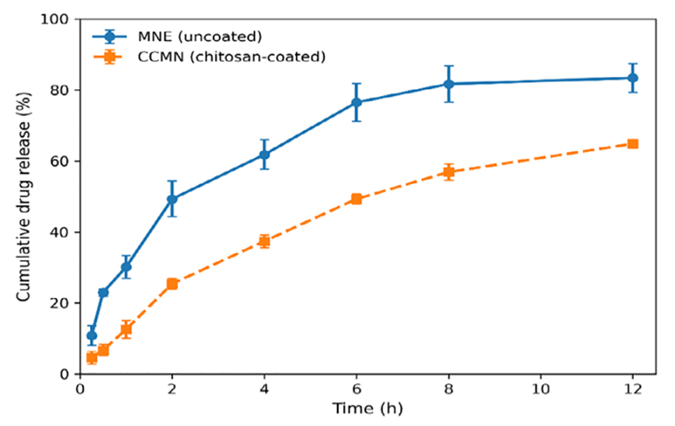 图11. 生理条件下,褪黑素载药纳米乳剂与壳聚糖包覆褪黑素纳米乳剂12小时内的体外累积释药曲线(平均值±标准差,n=3)。壳聚糖包覆修饰减缓了制剂的初期突释,并在12小时内实现了更平缓的缓释特征,这一结果与界面改性延缓药物扩散的作用机制一致。