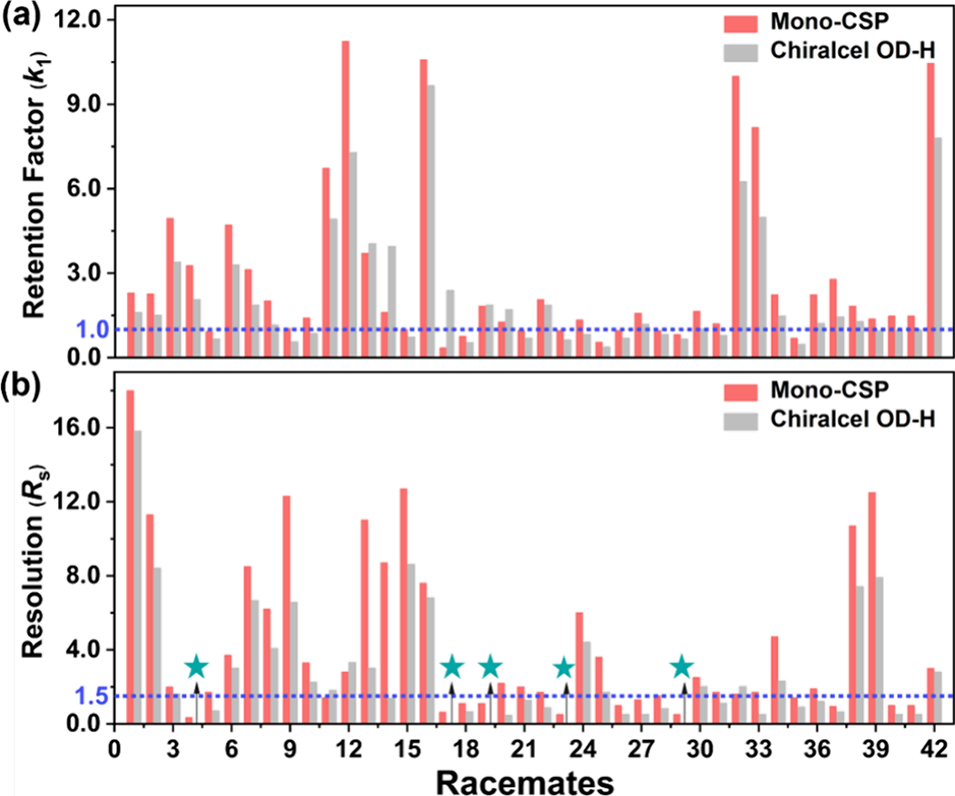 图6 Mono-CSP 色谱柱与 Chiralcel OD-H 色谱柱分离外消旋体的色谱数据统计图。(a) 保留因子;(b) 分离度(★代表未实现分离的外消旋体)。