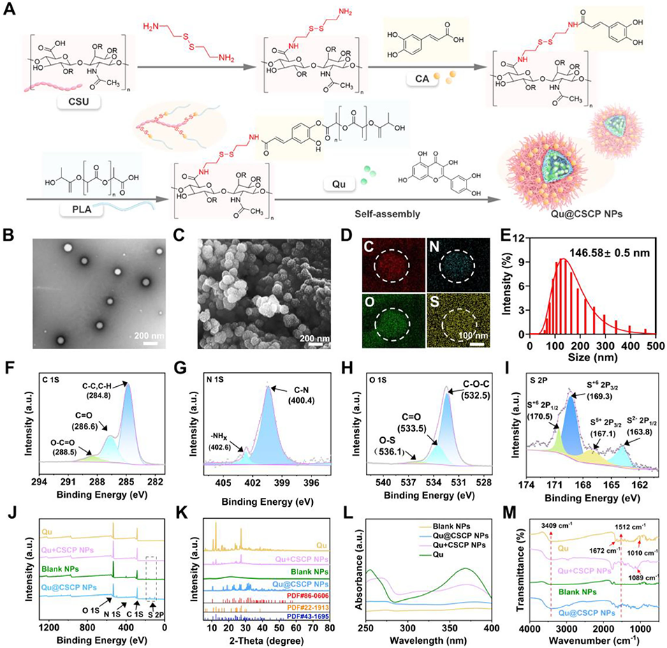 图1 Qu@CSCP 纳米粒的合成与表征。(A) Qu@CSCP 的合成路线;(B,C) Qu@CSCP 的透射电子显微镜(TEM)与扫描电子显微镜(SEM)图像;(D) Qu@CSCP 的 X 射线能谱(EDS)元素 Mapping 图;(E) Qu@CSCP 的粒径分布;(F-I) Qu@CSCP 的 C 1s、N 1s、O 1s、S 2p 轨道 X 射线光电子能谱(XPS),(J) Qu@CSCP 的 XPS 全谱;(K-M) Qu@CSCP 的结构与组成表征:(K) X 射线衍射(XRD)图谱、(L) 紫外-可见吸收光谱、(M) 傅里叶变换红外光谱(FTIR)(n=3)。