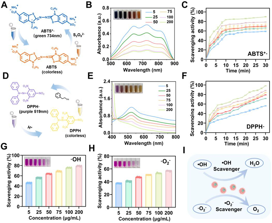 图2 Qu@CSCP 纳米粒的抗氧化能力。(A,D) Qu@CSCP 清除 ABTS+・(A) 与 DPPH・(D) 自由基的原理示意图;(B,E) 不同浓度 Qu@CSCP 处理后,ABTS+・(B) 与 DPPH・(E) 溶液的紫外-可见吸收光谱,插图为对应溶液的颜色变化,反映自由基清除程度;(C,F) 不同浓度 Qu@CSCP 在 pH 7.4 磷酸盐缓冲液(PBS)中清除 ABTS+・(C) 与 DPPH・(F) 的动力学曲线(n=3);(G,H) 不同浓度 Qu@CSCP 对羟基自由基(・OH)和超氧阴离子自由基(・O₂⁻)的清除能力;(I) Qu@CSCP 的抗氧化作用机制示意图(n=3)。