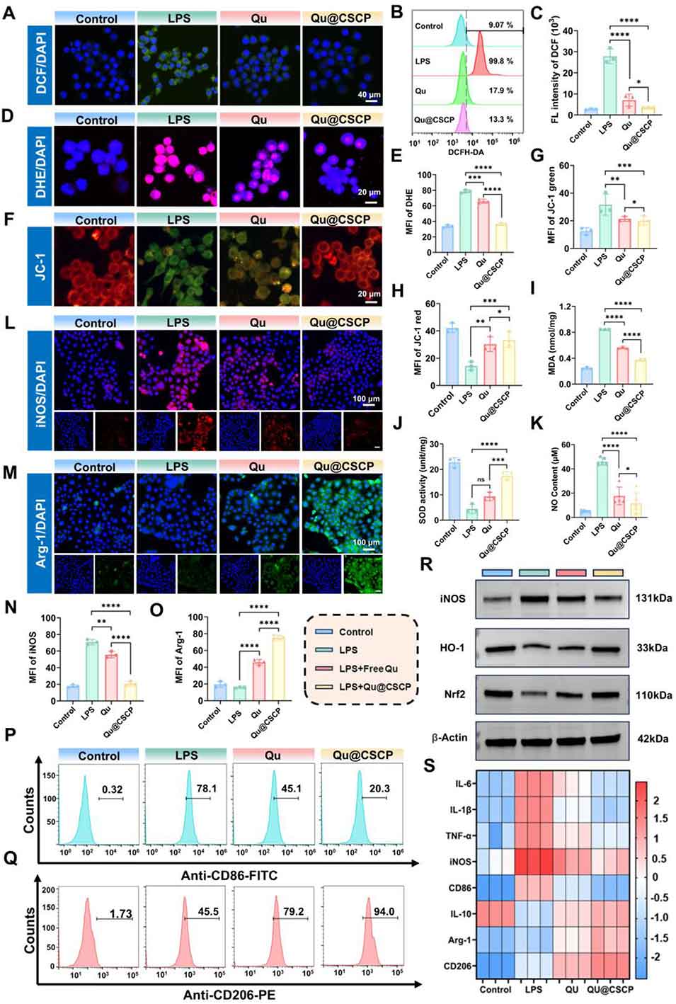 图4 Qu@CSCP 的体外抗氧化与抗炎活性。(A) 不同处理条件下,经 DCFH-DA 染色的 RAW 264.7 细胞的代表性共聚焦荧光图像;(B,C) 不同处理后 RAW 264.7 细胞内活性氧水平的流式细胞术分析结果;(D,E) 不同处理下,经二氢乙啶(DHE)染色的 RAW 264.7 细胞的荧光图像及半定量分析结果;(F-H) 不同处理后 RAW 264.7 细胞线粒体膜电位的 JC-1 染色图像及对应半定量分析结果;(I-K) 不同处理下 RAW 264.7 细胞中丙二醛(MDA)含量、超氧化物歧化酶(SOD)活性、一氧化氮(NO)水平的定量检测结果;(L-O) 不同处理后 RAW 264.7 细胞中 iNOS 与 Arg-1 表达的免疫荧光图像及半定量分析结果;(P,Q) 不同处理后 RAW 264.7 细胞中 M1 型(CD86⁺)、M2 型(CD206⁺)巨噬细胞比例的流式细胞术分析结果;(R) 不同处理后 RAW 264.7 细胞中 iNOS、HO-1、Nrf2 蛋白表达的蛋白免疫印迹(WB)分析结果;(S) 不同处理下 RAW 264.7 细胞中,促炎因子/标志物(IL-6、IL-1β、TNF-α、iNOS、CD86)与抗炎因子/标志物(IL-10、Arg-1、CD206)的 mRNA 相对表达水平热图。所有数据以均值 ± 标准差表示(n=3);*p<0.05,**p<0.01,***p<0.001,****p<0.0001。