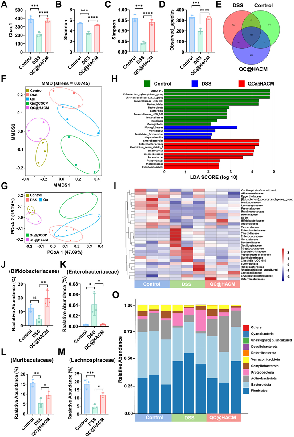 图8 QC@HACM 恢复 DSS 诱导溃疡性结肠炎(UC)小鼠的肠道菌群稳态。(A-D) 基于 Chao1 指数 (A)、Shannon 指数 (B)、Simpson 多样性指数 (C)、Observed-species 指数 (D) 评估的肠道菌群 α 多样性;(E) 对照组、DSS 模型组、QC@HACM 处理组之间共有与特有微生物物种的韦恩图;(F,G) 基于物种组成的非度量多维尺度分析(NMDS)与主坐标分析(PCoA)图,展示粪便菌群的 β 多样性;(H) 基于线性判别分析(LDA)的柱状图,识别对 QC@HACM 处理产生显著响应的微生物类群;(I) 科水平肠道菌群相对丰度热图,展示各组间的菌群组成变化,重点标注类群包括:双歧杆菌科 (J)、肠杆菌科 (K)、鼠杆菌科 (L)、毛螺菌科 (M);(O) 门水平相对丰度柱状图,展示不同处理组间微生物群落的组成差异。所有数据以均值 ± 标准差表示(n=3);*p<0.05,**p<0.01,***p<0.001,****p<0.0001。