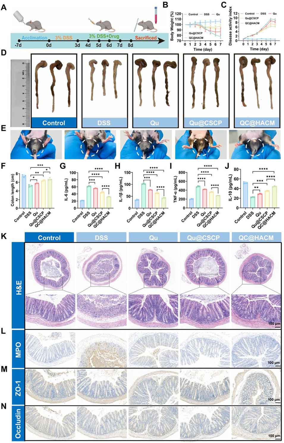 图7 QC@HACM 缓解 DSS 诱导结肠炎的炎症症状。(A) DSS 诱导结肠炎小鼠的治疗方案示意图;(B,C) 整个治疗周期内,不同组别小鼠的体重变化与疾病活动指数(DAI)评分变化;(D,E) 口服不同制剂后,小鼠结肠与肛周区域的大体照片;(F) 治疗后小鼠结肠长度的测量与统计分析结果;(G-J) 不同实验组小鼠结肠组织中,促炎细胞因子(IL-6、IL-1β、TNF-α)与抗炎细胞因子(IL-10)的定量分析结果;(K) 各组小鼠结肠组织的代表性苏木精-伊红(H&E)染色病理切片;(L) 小鼠结肠组织中髓过氧化物酶(MPO)的代表性免疫组化图像;(M,N) 不同处理组小鼠结肠组织中,紧密连接蛋白 ZO-1 与 Occludin 表达的免疫组化染色结果。所有数据以均值 ± 标准差表示(n=3);*p<0.05,**p<0.01,***p<0.001,****p<0.0001。