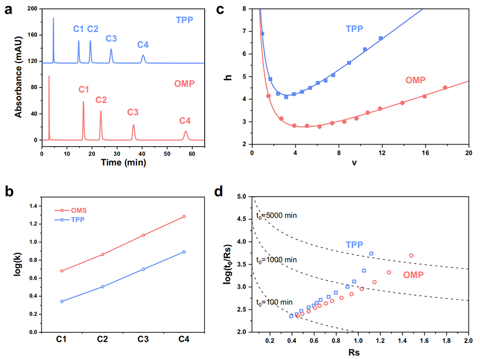 图4 有序介孔颗粒与全多孔颗粒的性能对比。a 烷基苯混合物在 15 cm 长的有序介孔颗粒和全多孔颗粒色谱柱上的色谱图(分析物:硫脲、甲苯、乙苯、丙苯、丁苯,按洗脱顺序排列;流动相:乙腈-水,体积比 60:40;紫外检测波长:214 nm);b 保留因子对比、c Knox 曲线及 d 有序介孔颗粒和全多孔颗粒的改良动力学图谱(有序介孔颗粒简称 OMP,全多孔颗粒简称 TPP)。