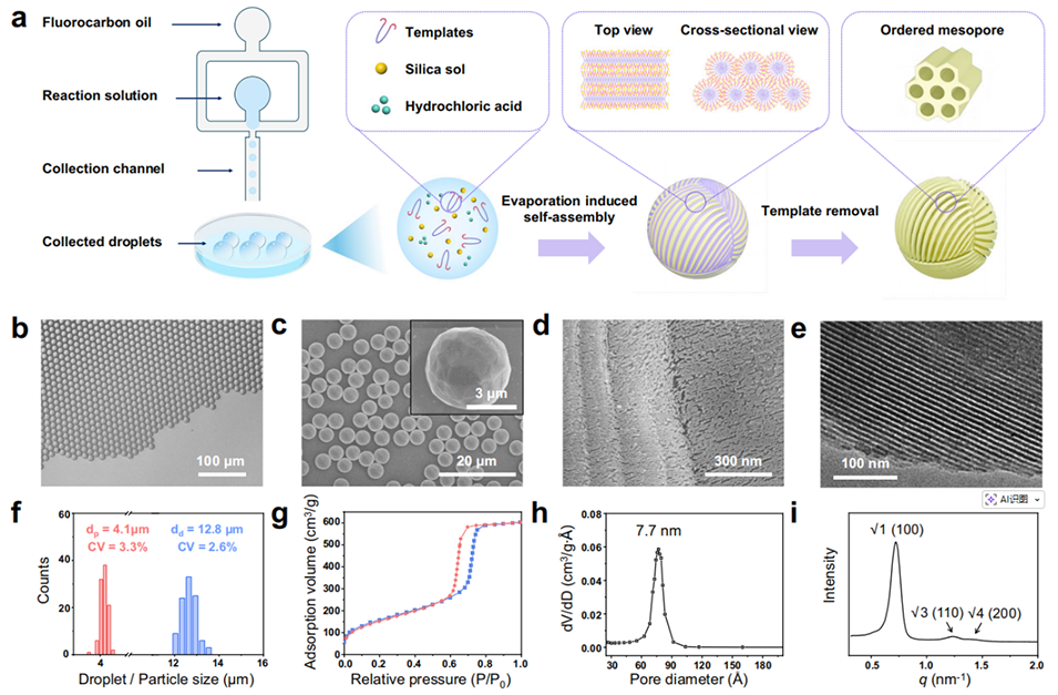 图1 具有有序介孔结构的单分散微球的合成与表征。a 有序介孔二氧化硅微球的合成示意图;b 微流控器件制备的单分散液滴的光学显微镜图像;c、d 不同放大倍数下所得有序介孔二氧化硅微球的扫描电子显微镜图像,e 透射电子显微镜图像;f 单分散液滴(蓝色)和微球(红色)的粒径分布分析;g 有序介孔二氧化硅微球的氮气吸脱附等温线、h 孔径分布及 i 小角 X 射线散射图谱。