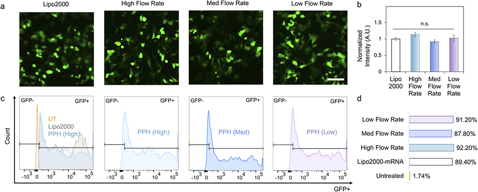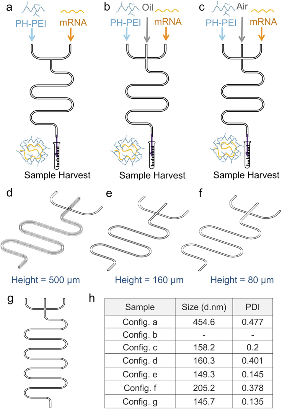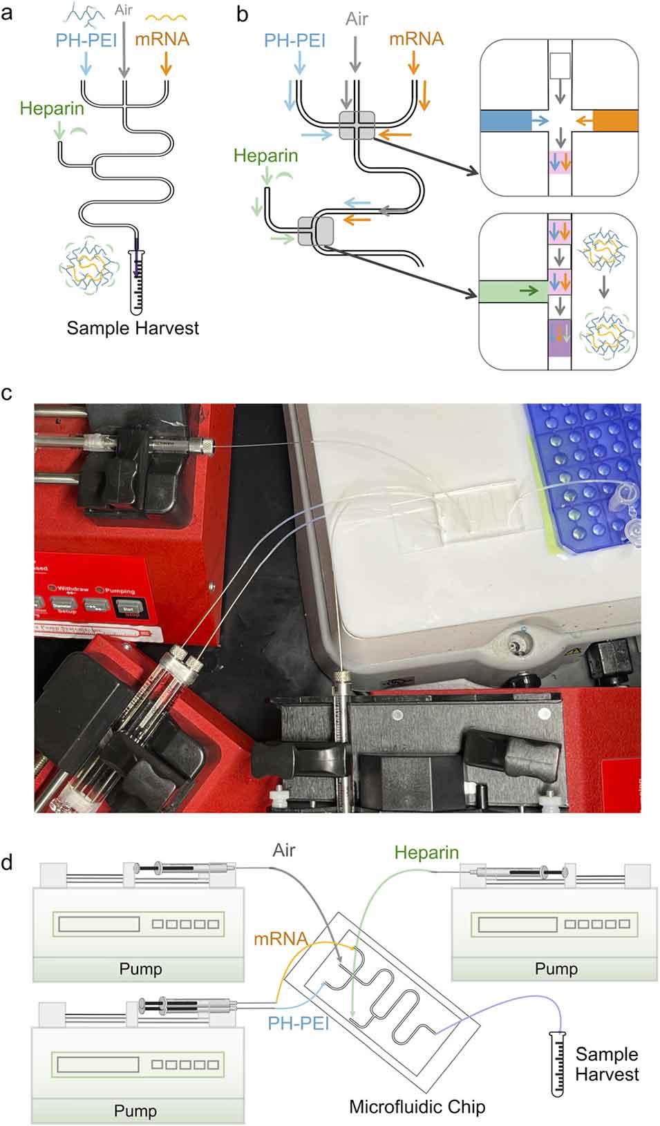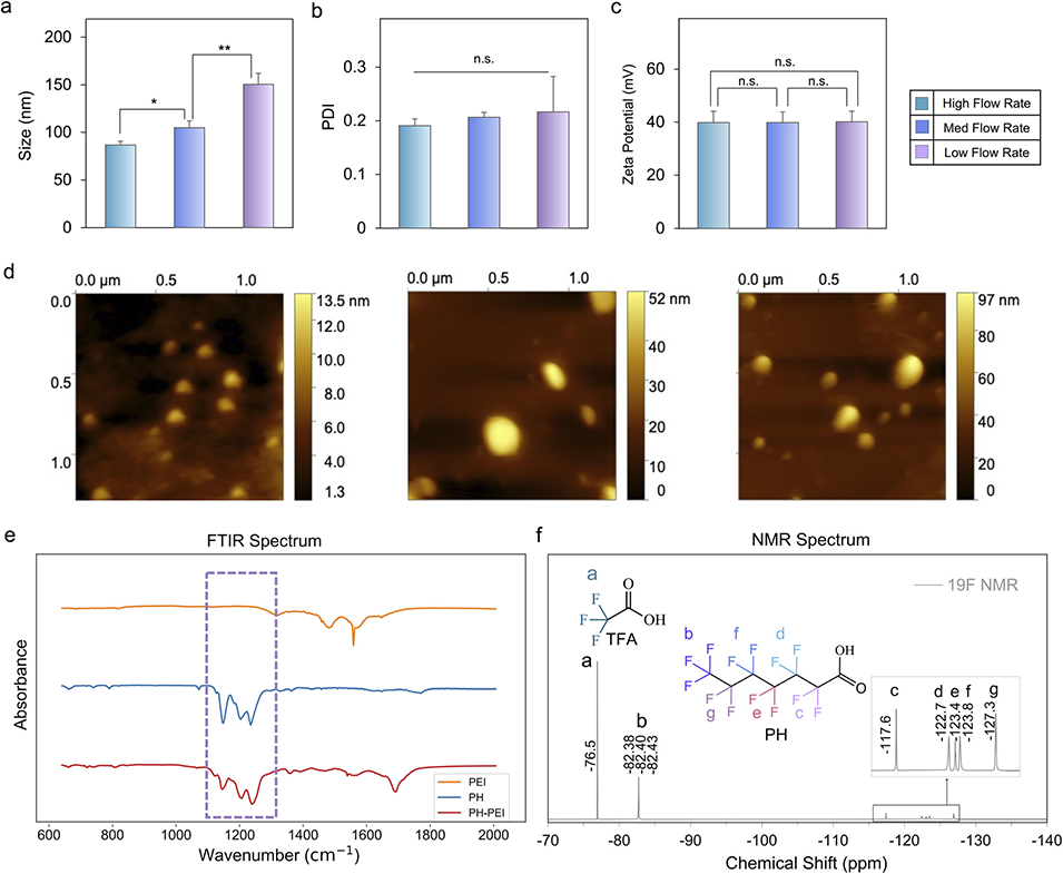2、通过调节气流速率可精准调控PH-PEI-mRNA-肝素(PPH)纳米颗粒的粒径(90~150nm),且始终保持低多分散性、稳定的ζ电位(约40mV),该平台还能实现一步式PPH复合物组装,合成效率提升50%,并在100余次合成循环中保持批次一致性,规模化生产时仍能维持颗粒均一性,远优于传统批量混合、转子-注射器法。