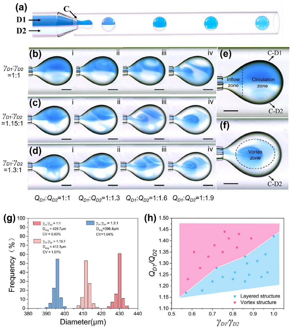 图1 (a) 用于生成液滴的微流控芯片示意图;(b) 界面张力差可忽略(<0.5%)时,随分散相流速差逐步增大记录的液滴形成过程;(c, d) 随分散相间界面张力差逐渐增大记录的液滴形成过程;(e) 具有层状内部结构的代表性液滴;(f) 具有环状内部分布的代表性液滴(添加亚甲基蓝以提高对比度)。所有图像均由高速彩色相机实时采集,比例尺:100 微米;(g) 液滴平均粒径分布及变异系数;(h) 流速比和界面张力比对液滴内部流态的影响。