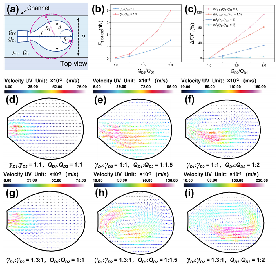 图2 微液滴内部涡旋流的演化过程。结合液滴受力分析与微颗粒图像测速技术(μ-PIV)表征,阐明不同驱动条件下的流型转变:(a) 液滴几何结构与受力平衡示意图;(b) 不同界面张力差(Δγ)下,分散相间剪切力(FτD1−D2)随流速差(ΔQ)的变化规律;(c) 连续相 - 分散相间剪切力(FτC−D)、流体压力(Fp)和界面张力(Fγ)的相对增幅随流速差的变化关系;(d) 无流速差和界面张力差时的层流结构;(e) 流速比为 1:1.5 时的涡旋流结构;(f) 流速比为 1:2 时的涡旋流结构;(g) 界面张力比为 1.3:1 时的对流主导型结构;(h) 流速比 1:1.5 与界面张力比 1.3:1 协同驱动下形成的涡旋流结构;(i) 流速比 1:2 与界面张力比 1.3:1 协同驱动下形成的强涡旋流结构。