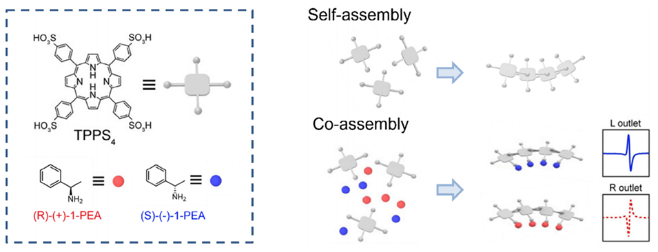 图4 超分子手性组装示意图,包含两种组装路径:TPPS4 的自组装路径,以及 TPPS4 与 PEA的共组装路径。