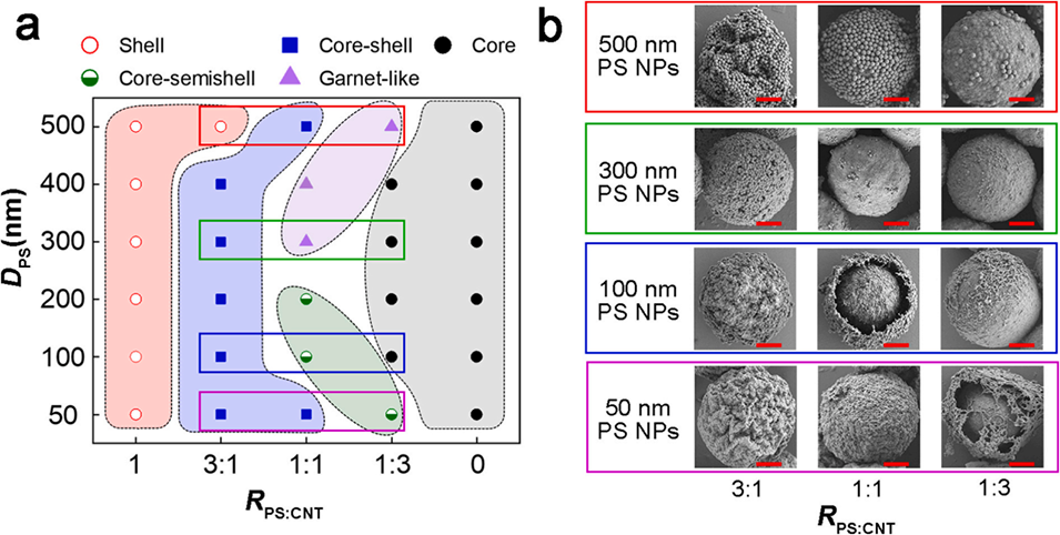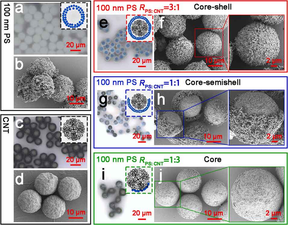 2、通过调节 PS 颗粒尺寸、PS 与 CNT 的质量比及溶剂去除动力学(通过控制油相中 Span 80 浓度和干燥温度实现),成功构筑了多种结构,包括核壳微胶囊、核壳微球、核半壳微球、石榴石状及致密微球。